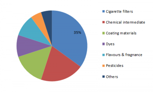 On the basis of the application, the global market is segmented into cigarette filter, chemical intermediate, coating materials, dye, flavors & fragrance, pesticides, synthesizer, and others.