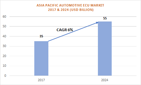 Asia Pacific Automotive Electronic Control Unit (ECU) Market exceeded USD 35 billion in 2017 and is expected to cross at over 6% CAGR from 2018 to 2024 due to rapid evolution of the automobile industry and the increasing penetration of vehicle & system manufacturers.