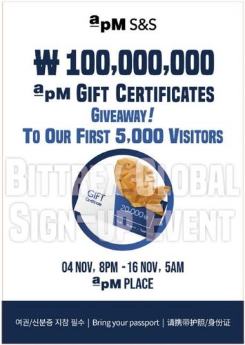 The event will be held at apM PLACE for all customers and visitors of apM, apM PLACE, and apM Luxe from 4 November, 20:00to 16 November, 05:00 KST. KRW 20,000 worth of the apM gift certificates will be provided to the first 5,000 event participants who completes the pre-registration of apM Members mobile application and sign-up and KYC for the Bittrex Global at the event venue. The gift certificates can be redeemed at clothing shops of apM, apM PLACE, and apM Luxe. Complimentary Korean traditional waffles‘Boongeo-ppang’ will also be offered to all event participants during the event.