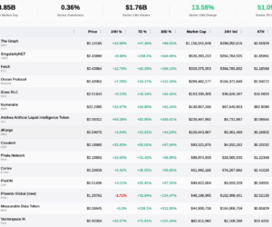 The market sector of AI crypto continues to sizzle, with the top 30 tokens all in the green over the last 30 days, a trend that has left many investors wondering: how frothy can this top possibly get? AI cryptos are up over 51% over the past week, with a total sector market cap of…