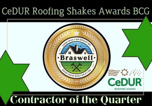 Owens Corning Roofing Platinum Preferred Contractor, Braswell Construction Group (BCG), was recently awarded CeDUR Roofing Shakes ‘Contractor of the Quarter’ for their industry-leading contributions to the composite synthetic roofing product market. This acknowledgment shows BCG’s ongoing commitment to deliver a results-focused, customer-driven method to running their company while also providing credible, reliable, trusted services with premium client care for their customers. This honor compliments BCG’s continuous dedication to education and training, and also ongoing advancement in market understanding and expertise.