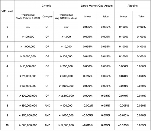 BitMax.io will implement a new tiered VIP transaction fee & rebate structure for both traders and BTMX holders within the BitMax.io ecosystem, 10:00 a.m. EDT, October 23rd, 2019. The new structure will allow customers to receive up to a 2.5 bps (0.025%) rebate for providing liquidity (“maker”) and pay as little as a 1.5 bps (0.015%) fee for taking liquidity (“taker”) on the platform.