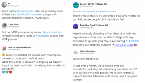 Mushroom has provided free phone lines/call handling software to 70+ Covid-19 community groups, helping thousands of people contact local volunteers; including a homeless man who’d not eaten for days, and a 102-year-old war veteran whose partner was comforted and provided with shopping and medication.