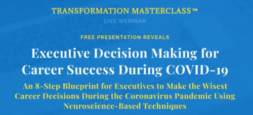 Transformation Masterclass is offering a free online live webinar: Executive Decision Making for Career Success During COVID-19 on Wednesday, August 5, 2020 at 2:00 p.m. Eastern Daylight Time.