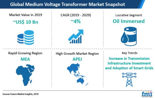 Future Market Insights has published a new market research report on the medium voltage transformer market that contains global industry analysis during 2014–2018 and opportunity assessment during 2019–2029. The report covers the latest trends, key success factors, market influencing factors, key information, forecasting factors, macroeconomics factors, and past market scenario. The report analyzes the medium voltage transformer market and provides critical insights for the forecast period of 2019-2029. The global medium voltage transformer market size is estimated to reach ~US$ 10 Bn in 2019, and expand at a CAGR of ~5% during the projected period of 2019-2029.