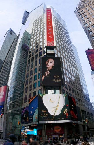 Recently, the giant advertisement of the cooperation “Laomiao X Bao BaoWan” launched by famous Chinese jewelry brand, Laomiao Jewelry and internationally renowned designer Ms.Wan has appeared on the large screen of New York Times Square…
