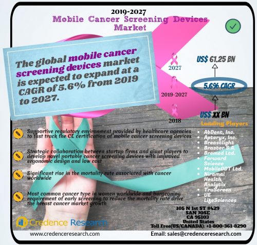 The latest market report published by Credence Research, Inc. “Global Mobile Cancer Screening Devices Market – Growth, Future Prospects, Competitive Analysis, 2019- 2027,” the global mobile cancer screening devices market is expected to expand at a CAGR of 5.6% from 2019 to 2027.