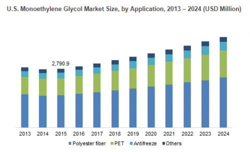 The major application segments include polyester fiber, PET, antifreeze & coolants, and chemical intermediates. Minor applications include leather processing, water based adhesive, Latex paints, asphalt emulsions, humectants, etc. and have been included in others segment Among these, polyester fiber and PET will collectively hold more than 70% of the share in overall monoethylene glycol market expanding at a substantial rate by 2024.