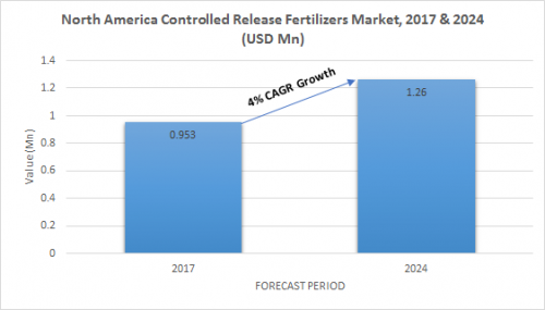 North America Controlled Release Fertilizers Market value exceeded USD 953 Thousand in 2017 and is predicted to see growth of 4.0% to reach USD 1.26 Mn by 2024