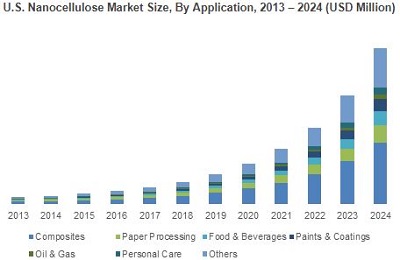 In the nanocellulose market, nanofibrillated cellulose segment is said to gain the highest share of over USD 540 million by 2024 owing to its superior properties. Bacterial nanocellulose market will grow at a highest CAGR of over 40% to capture a market share close to USD 27 million by 2024.