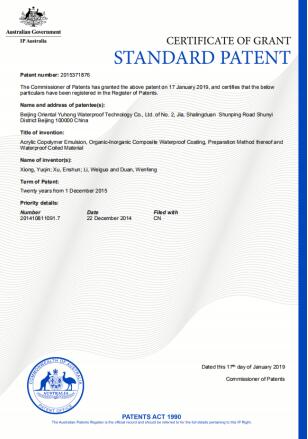 It is learned that Australia’s standard for patent application is relatively high, which requires a high novelty, creativity, and practicability of a product. IP Australia obtains powerful protection for a patent. Oriental Yuhong has applied for this patent issued by IP Australia since December 1, 2015. This patent technology realizes the unique pre-coated anti-adhesive effect of HDPE products, which can effectively eliminate the hidden danger of water channeling.