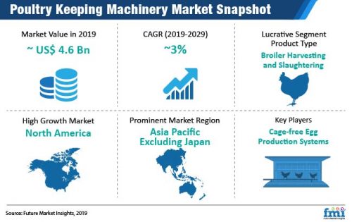 The newest market research study by Future Market Insights on poultry keeping machinery finds that the market was valued nearly at US$ 4.5 Bn in 2018, and is projected to grow by ~3% CAGR during the forecast period of 2019-2029. The study mainly attributes the rise in consumption of poultry meat for the positive growth prospects of the poultry keeping machinery market. The poultry keeping machinery market has a high potential to grow in regions such as Latin America, Asia Pacific excluding Japan and North America, according to the study.