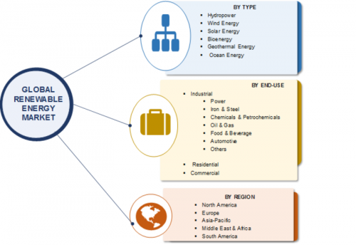Renewable Energy market has been segmented on the basis of type, end-use, and region. Based on type, the market is classified into hydropower, wind energy, solar energy, bioenergy, geothermal energy, and ocean energy. Hydropower is the leading source of renewable energy and contributes major share to the total renewable energy produced, globally. In 2017, the global hydropower installed capacity reached 1,200 GW. Globally, there are several opportunities available for the development of hydropower generation, including almost 10,000 TWh/year unutilized hydropower potential. Some of the leading countries using hydropower generation are China, India, Canada, and Russia.