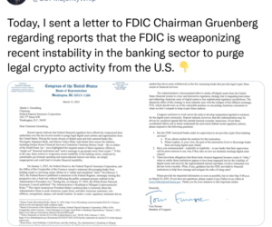 Tom Emmer, Republican Congressman for Minnesota, wrote a letter to the Chairman of the Federal Deposit Insurance Corporation (FDIC), Mark Gruenberg, on March 15 expressing his concerns about the recent closures of digital asset and tech-centered banks like Silvergate, Signature Bank, and Silicon Valley Bank. FDIC weaponizing banks Emmer shared the letter on Twitter, declaring…