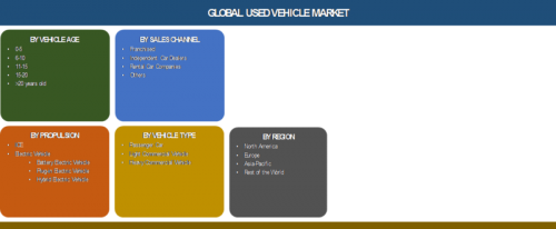 The global used vehicle market is segmented based on vehicle age, vehicle type, propulsion, sales channel, and region.